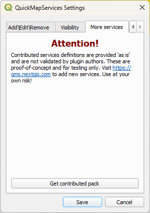 6. In the QuickMapServices Settings dialog, go to the More Services tab and click Get contributed pack.