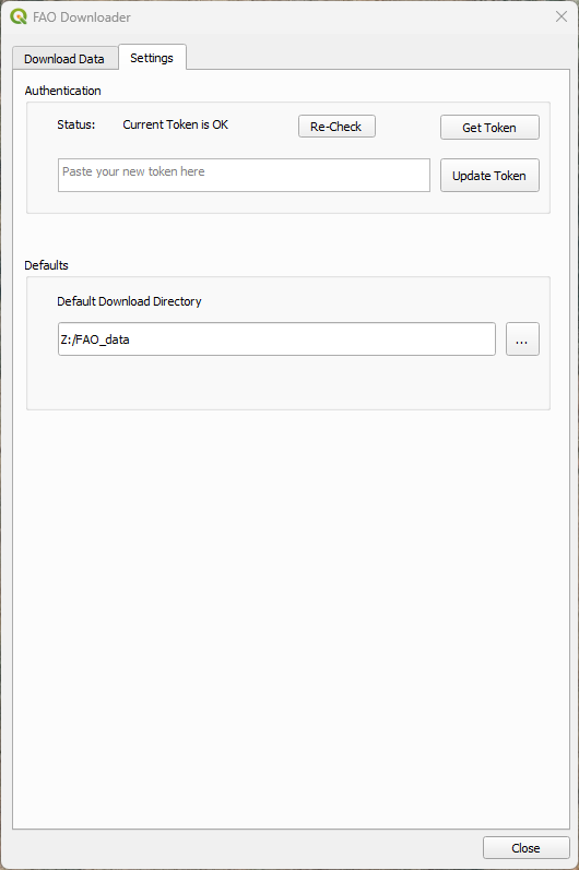 2. In the Settings tab of the FAO Downloader plugin you need to fill in your token.