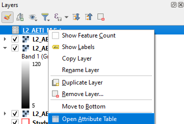 4. In the Layers panel, right-click on L2_AETI_M_list and choose Open Attribute Table from the context menu and inspect the contents of the CSV file.