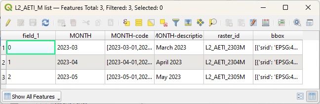 The attribute table show the downloaded months, raster ID's and the bounding box: