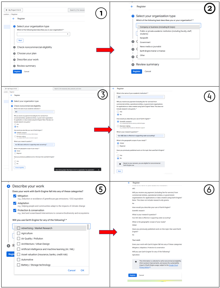 3- Describe Your Work: Fill out the questionnaire detailing how you plan to use Earth Engine for your projects.