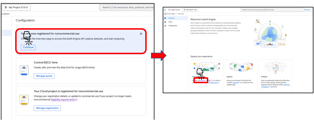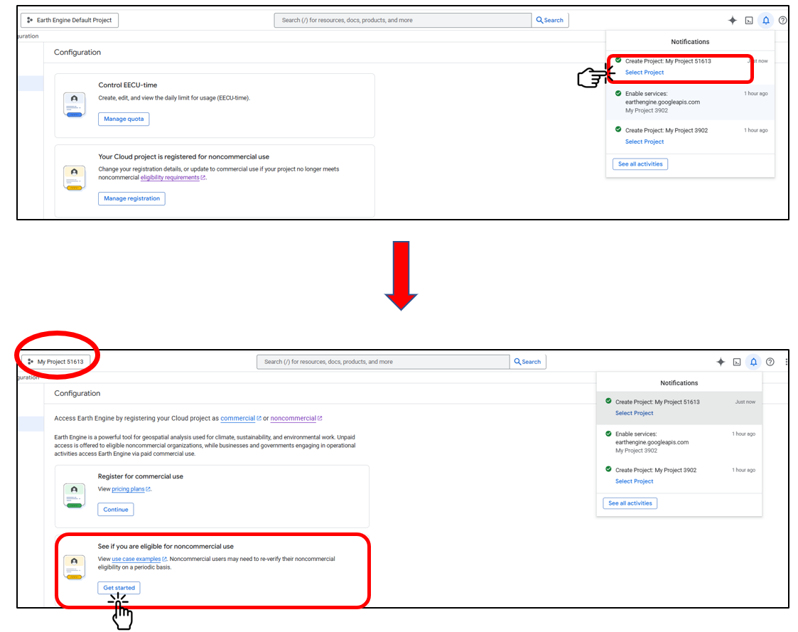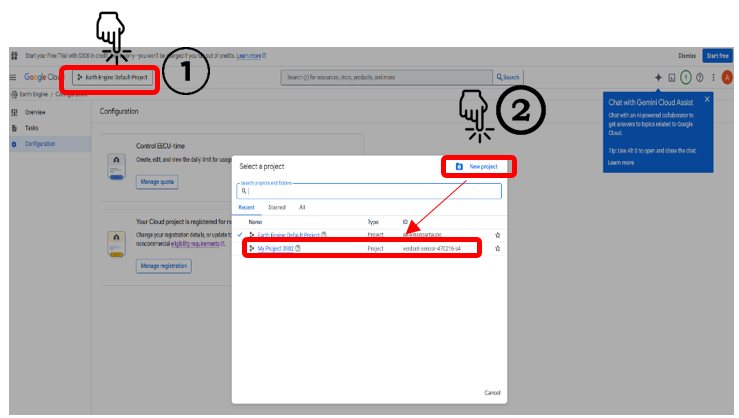 ** You will be redirected to the Google Cloud Console. Here, you'll link GEE to a Cloud project**