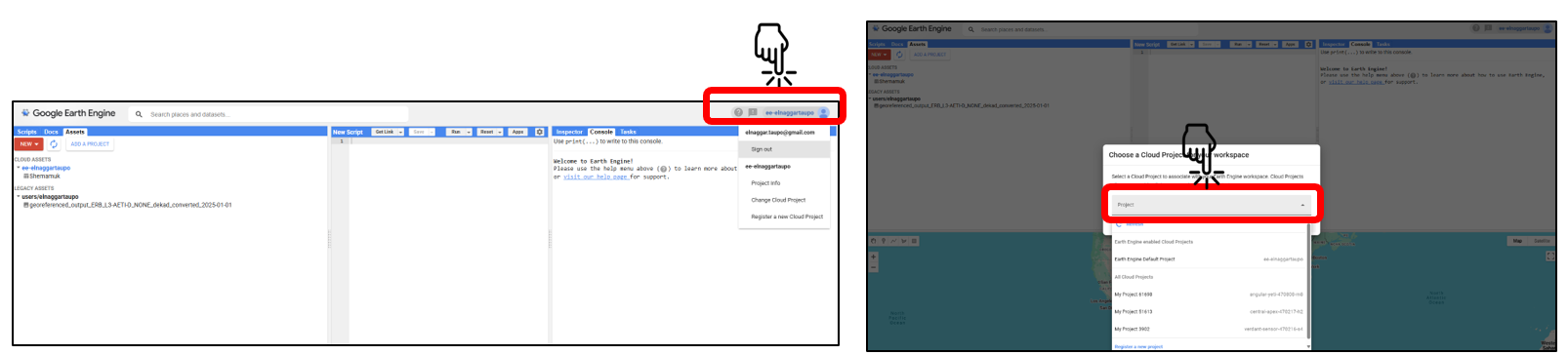 Click the Project Selection Menu located in the top-right corner of the Earth Engine interface (highlighted in the first image).
