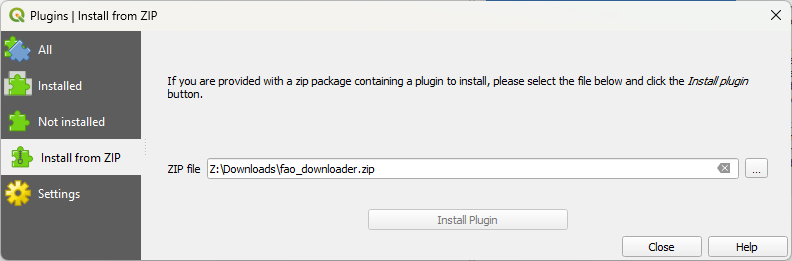 The FAO Downloader plugin is not yet available through the QGIS Plugins Manager. In the following steps, you'll learn how to install the plugin from a ZIP file.