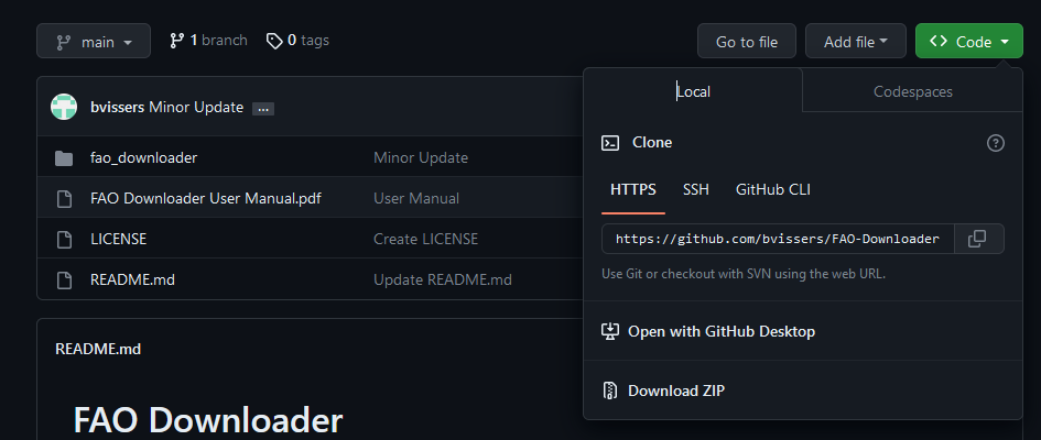 1. Go in your web browser to the GitHub repository of the FAO Downloader plugin: https://github.com/bvissers/FAO-Downloader