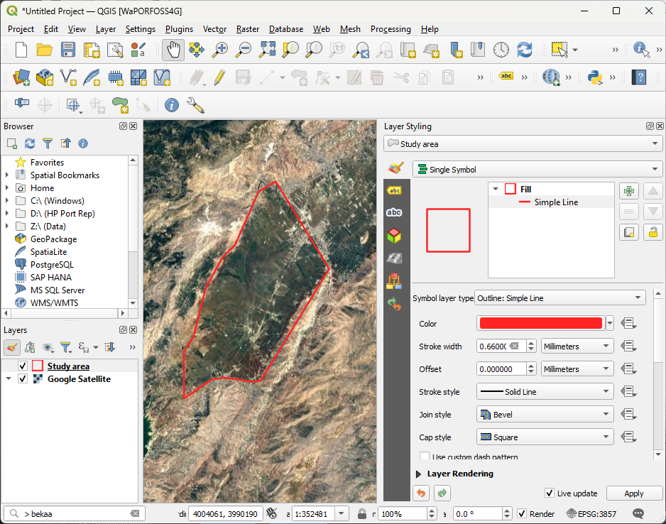 Now the Study are polygon has a random style. Let's change the style, so we only have a red outline.