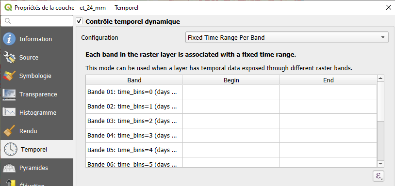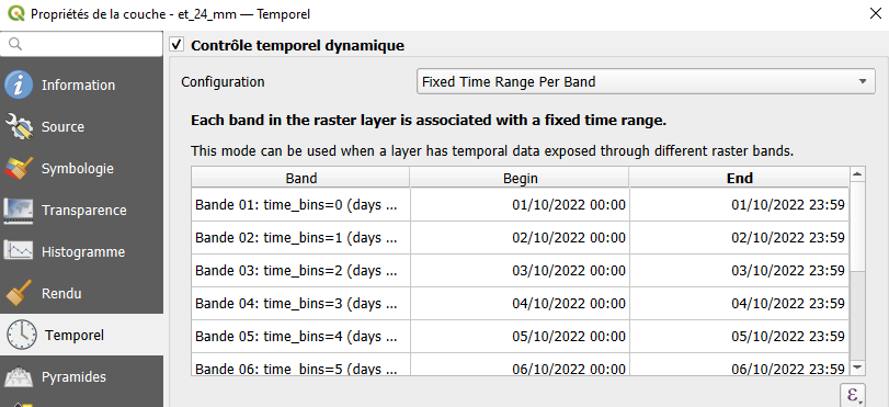 Tout d'abord, nous devons configurer le raster multibande en tant que couche temporelle.