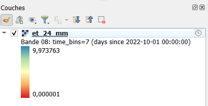 Maintenant, nous devons indiquer les heures de début et de fin de chaque couche raster. Chaque bande représente une journée, à partir du 1er octobre 2022 dans notre exemple, et couvre 24 heures d'évapotranspiration.